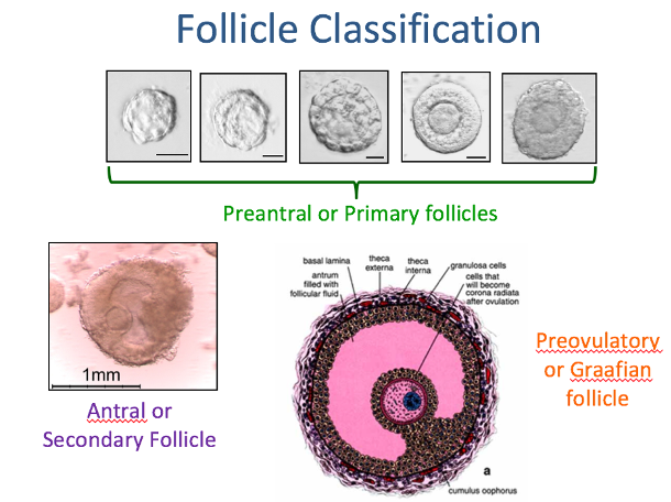 Resting follicles that will go on to grow, are only a small cohort (of about 40 or 50) that initiate growth and you have initiation (A cohort of early follicle leave the resting pool and grow continuously) and recruitment (They will NOT continue to grow unless they reach the size at which they respond to changes in FSH that occur in the menstrual cycle) out of the resting pool.