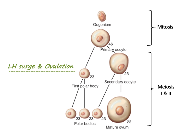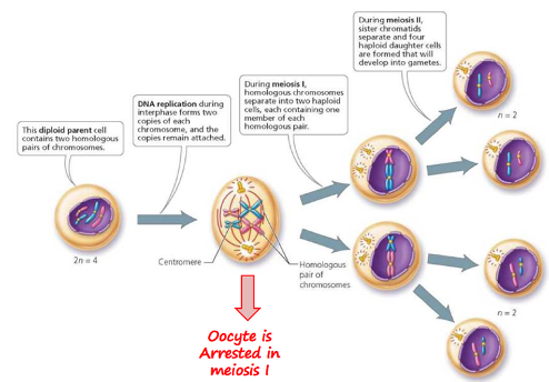 In the fetal ovary, the oocyte is arrested and the oogonia forms by mitosis and enters meiosis 1. They line up on the spindle and arrest and remain until the LH surge which isn’t until late in the menstrual cycle.