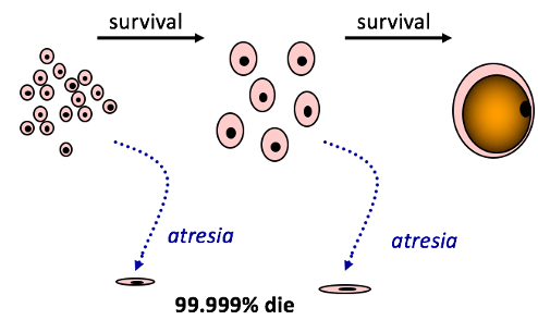 Thousands of the primordial follicles are made but most die through atresia and only a few make it into the menstrual cycle.