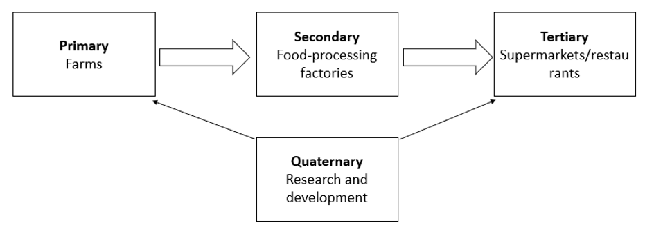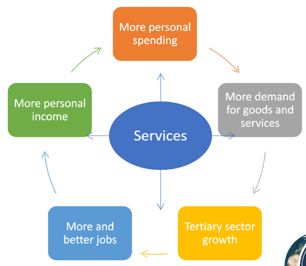 Stage 3 (post-industrial): tertiary sector becomes dominant as incomes rise and demand for services increases.
