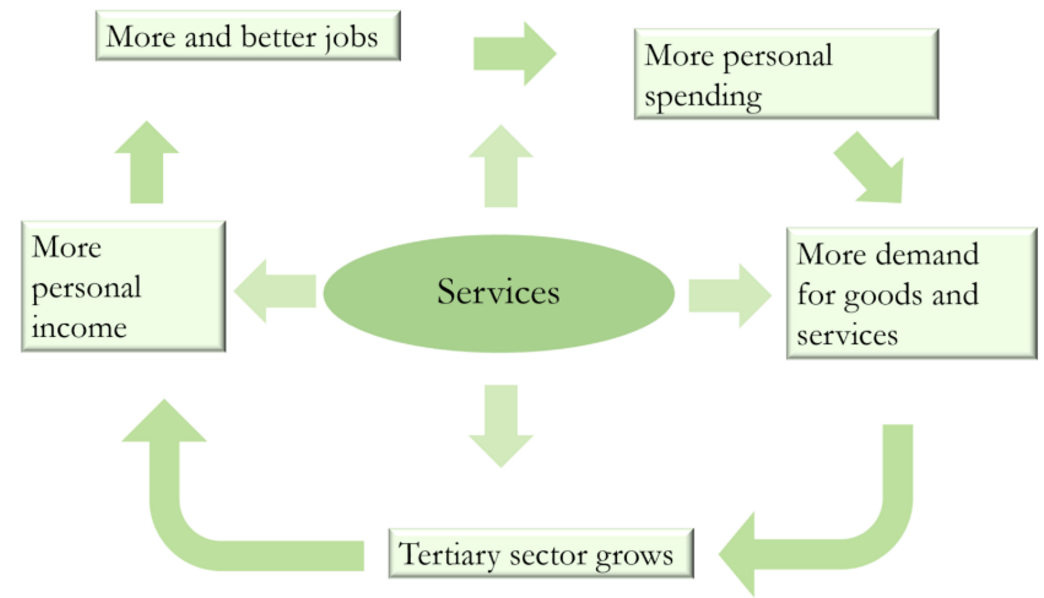 Rising wages increase consumer demand for services such as leisure and healthcare.