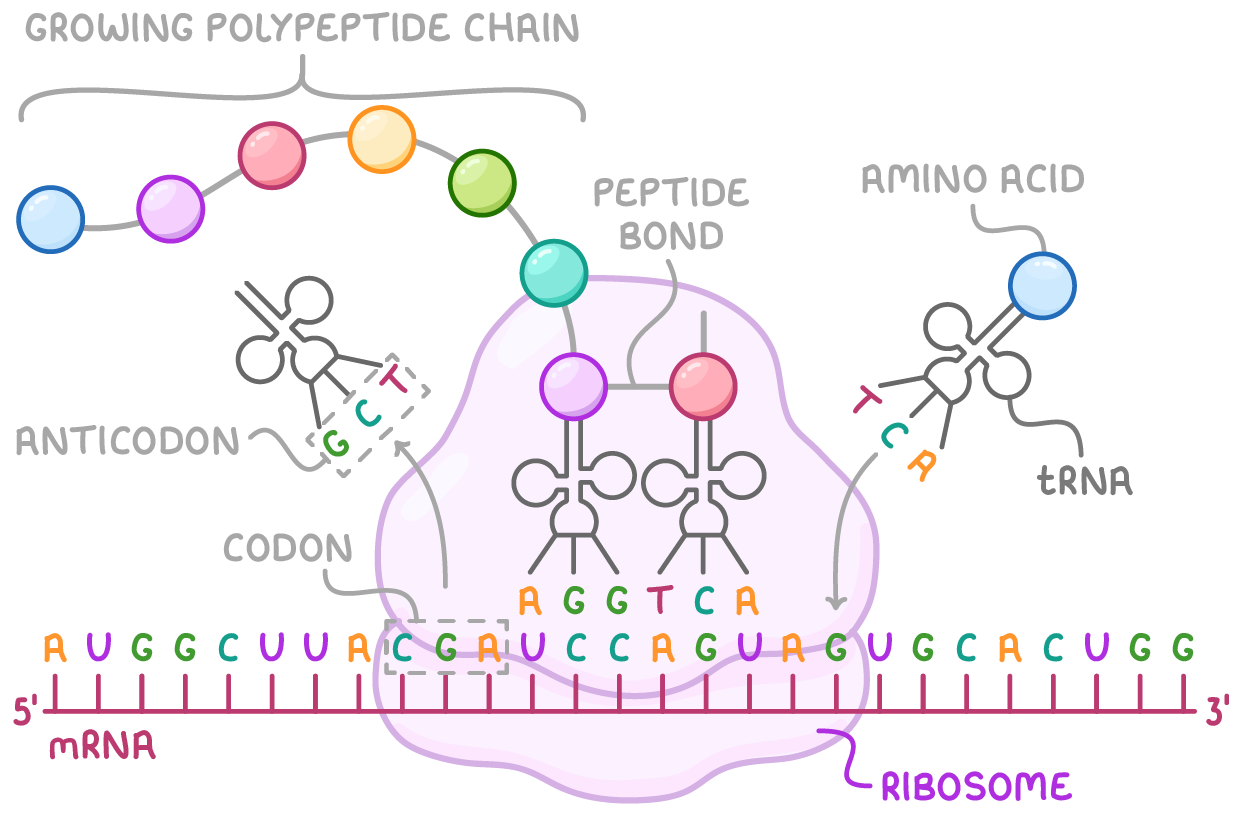 The ribosomes moves along mRNA, allowing another tRNA molecule, carrying another amino acid, to bind to next codon on mRNA
