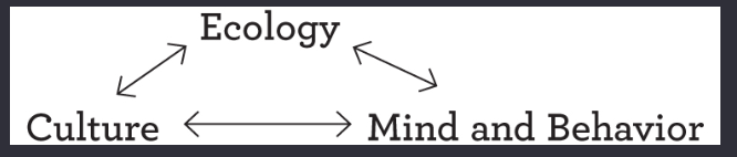 In this model, everything affects everything else. Ecology changes the culture, but culture also changes the ecology. Ecology changes the mind, but the mind changes the ecology, too. Perhaps most importantly, culture and the minds of the people who live in a culture change each other over time as well.