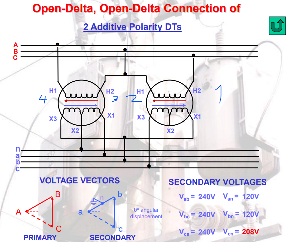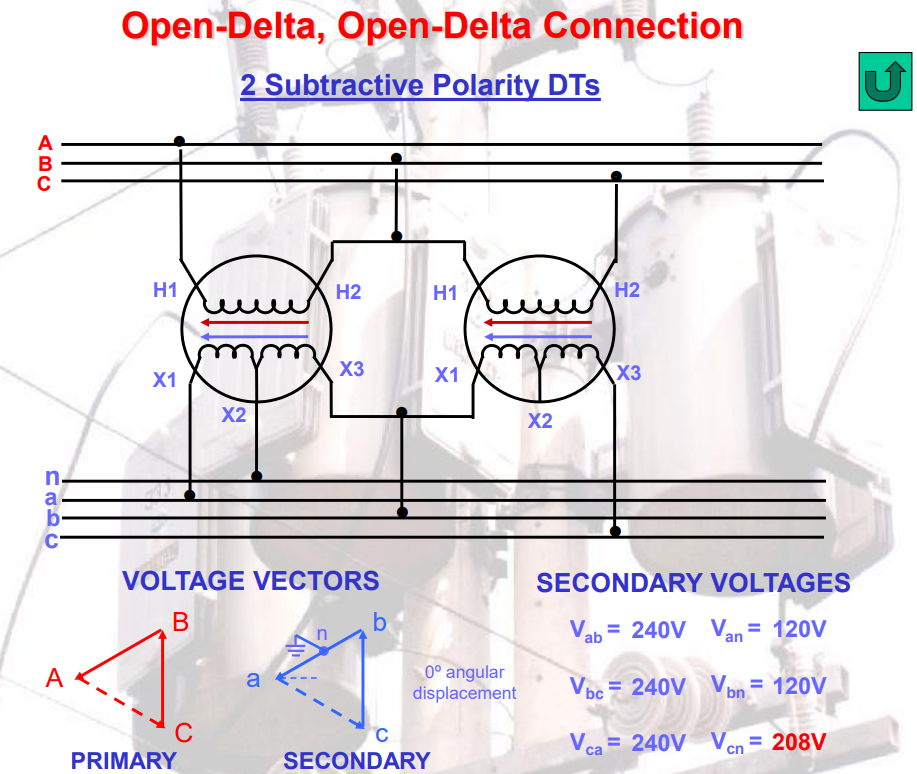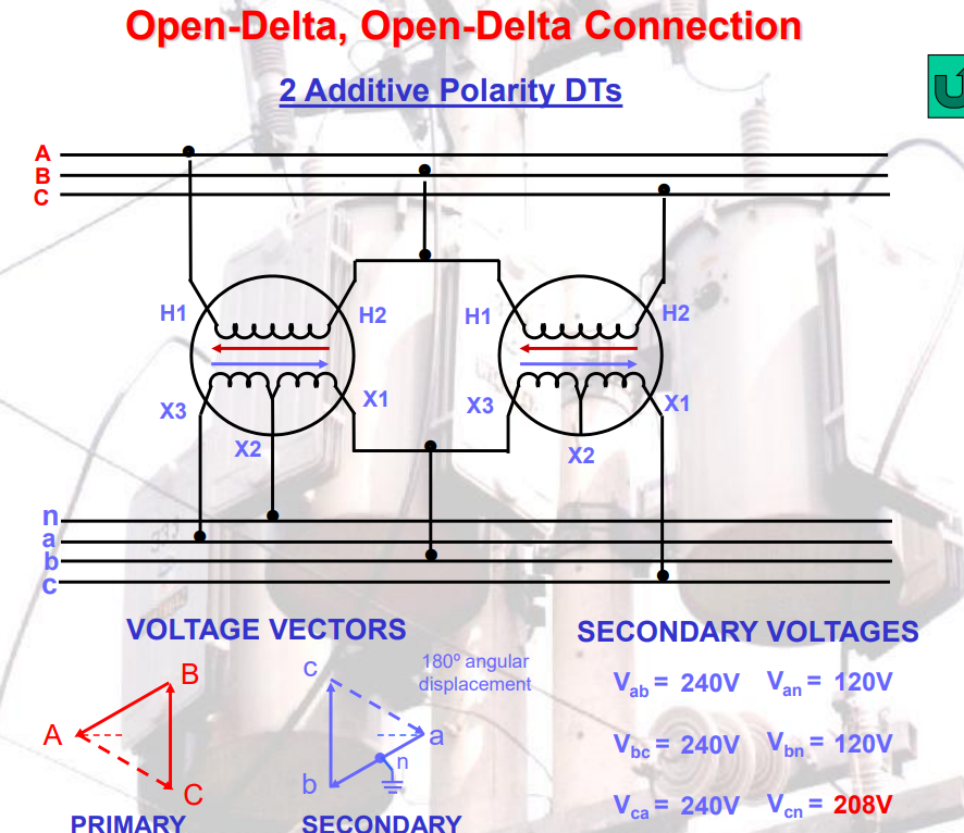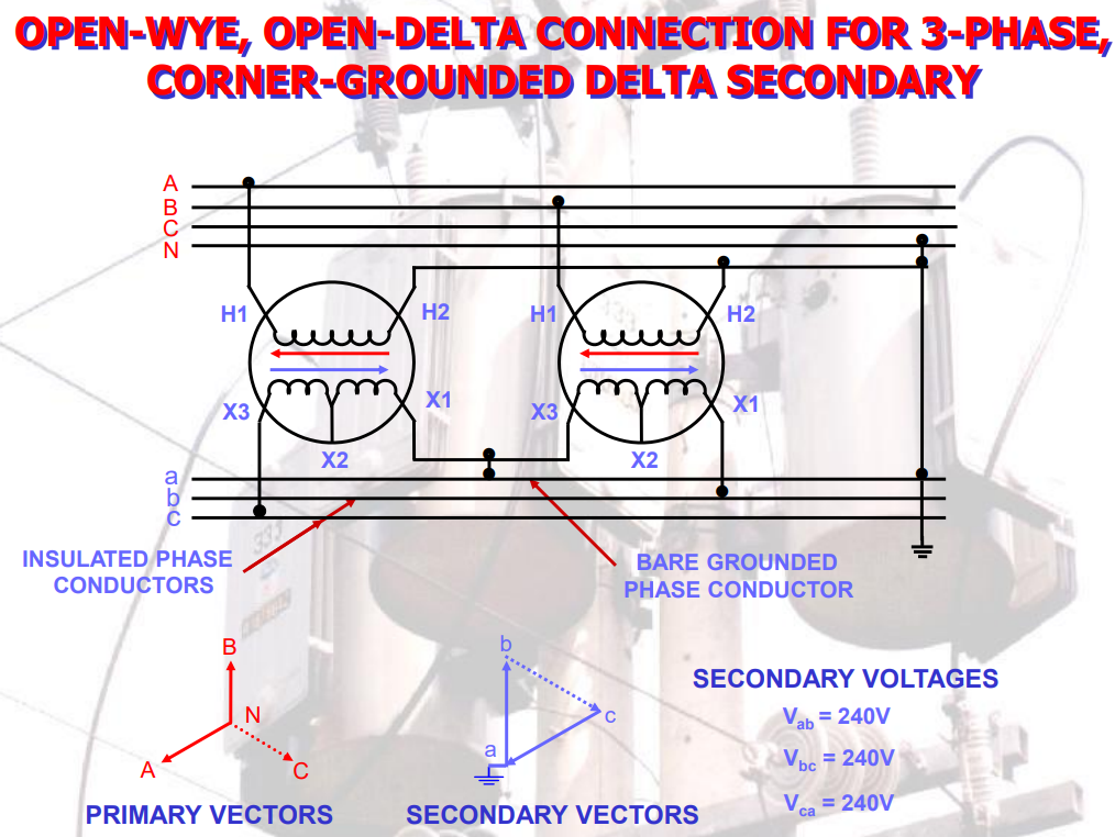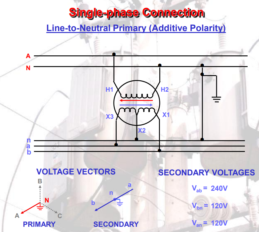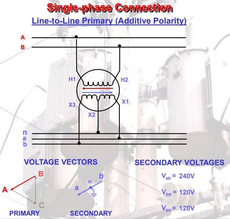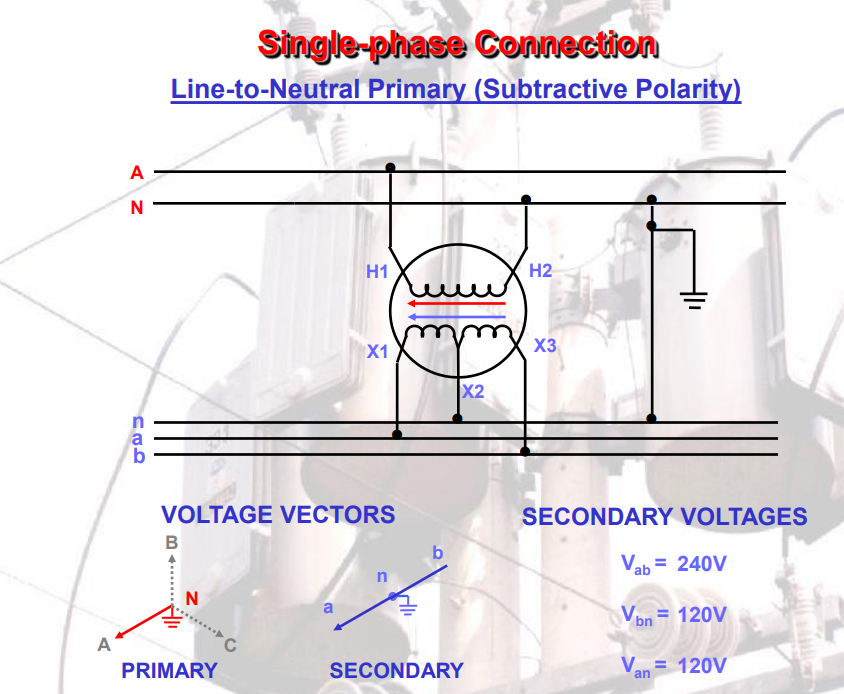 Mid-tapped secondary suitable for 2-wire service at voltage 240V, or for 3-wire service. Cannot be connected for 2-wire service at voltage 120V.