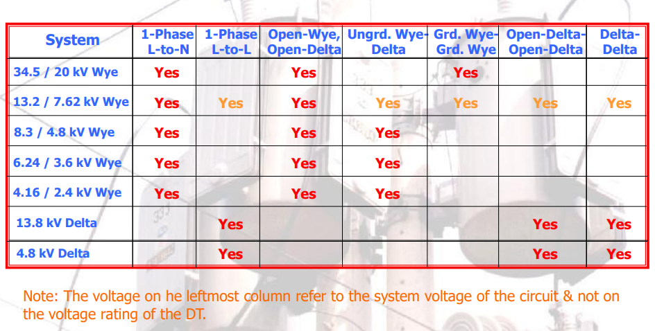 Single-bushing DTs for line-to-ground connections on effectively grounded systems with line-to-line voltages of 34.5kV.