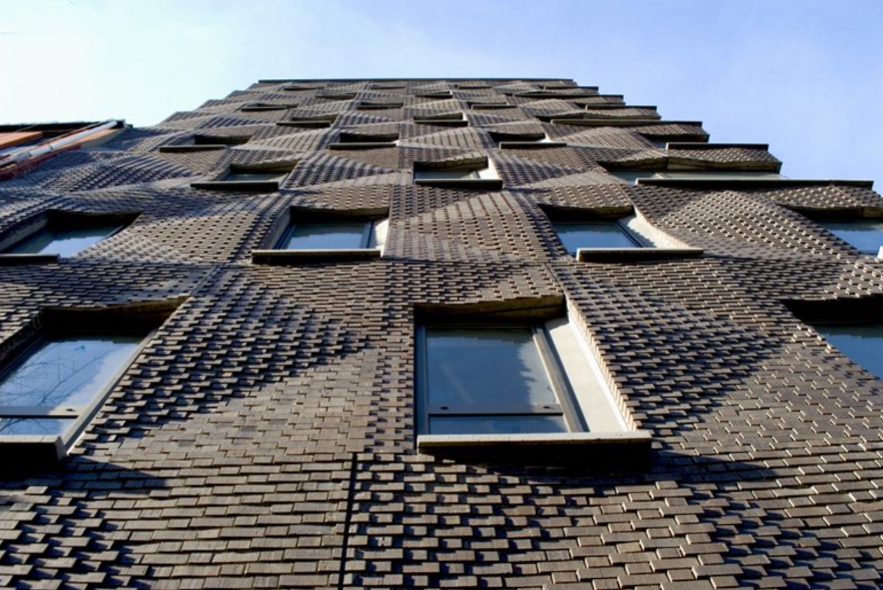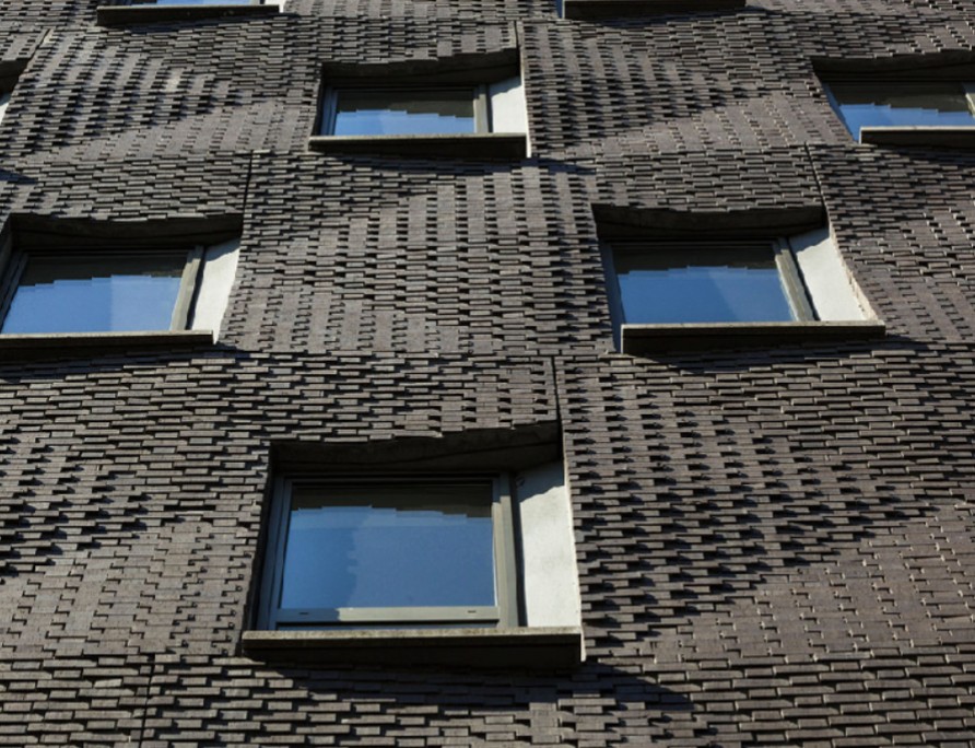 Special bricks are designed to be held in the mold and cast into concrete panels, with anchors on the inside face