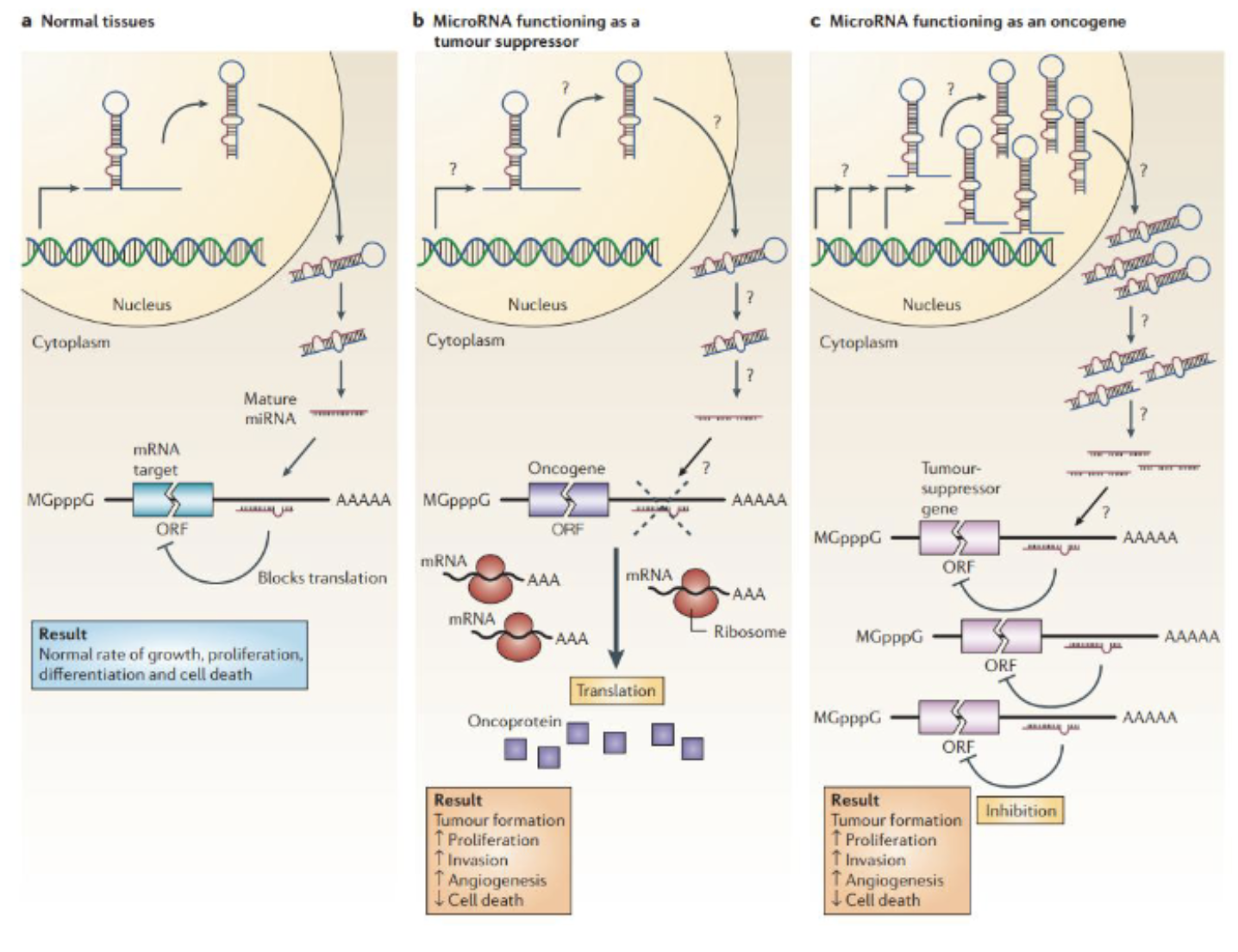 Reduction/deletion of tumour suppressing miRNAs promotes tumourigenesis, which could happen due to defects at any stage of miRNA biogenesis (amplification of miRNA gene, constitutively active promoter, increased processing or stability of miRNA)