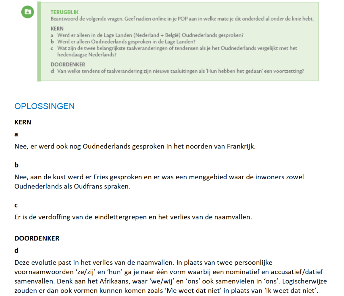 Jullie kunnen het naamvalsysteem uitleggen en herkennen, jullie kunnen iets meer vertellen over het Fries en het Afrikaans, over "hebban olla vogala nestas ..." en over de verandering van Oudnederlands via Middelnederlands naar het Nieuwnederlands.