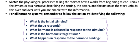 · Describe (sketch)step-by-step, the process by which each of the following regulatory systems we covered in lecture. Identify the trigger for secretion, the organ that secretes it, the target tissue and the response of the target tissue to the hormone for each: