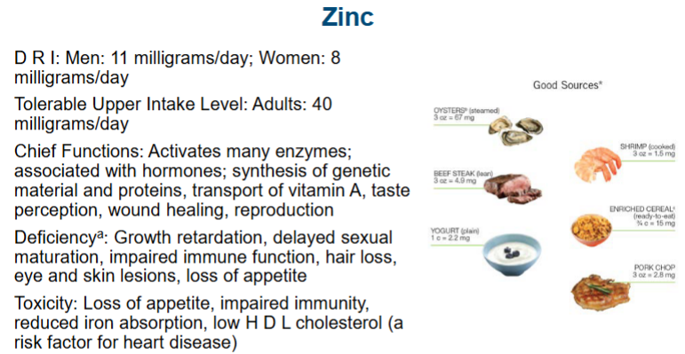 Essential to wound healing, sperm production, taste perception, normal metabolic rate, nerve and brain functioning, bone growth, and normal development in children.