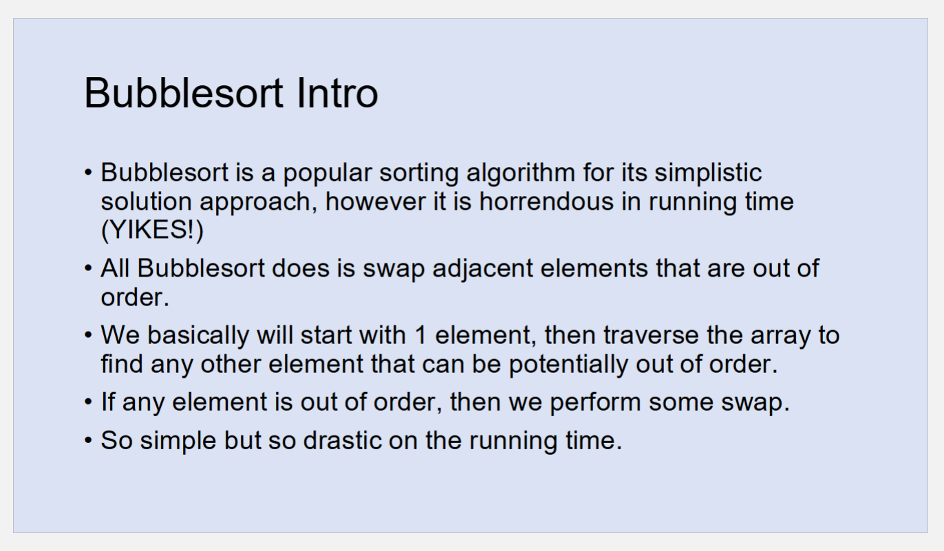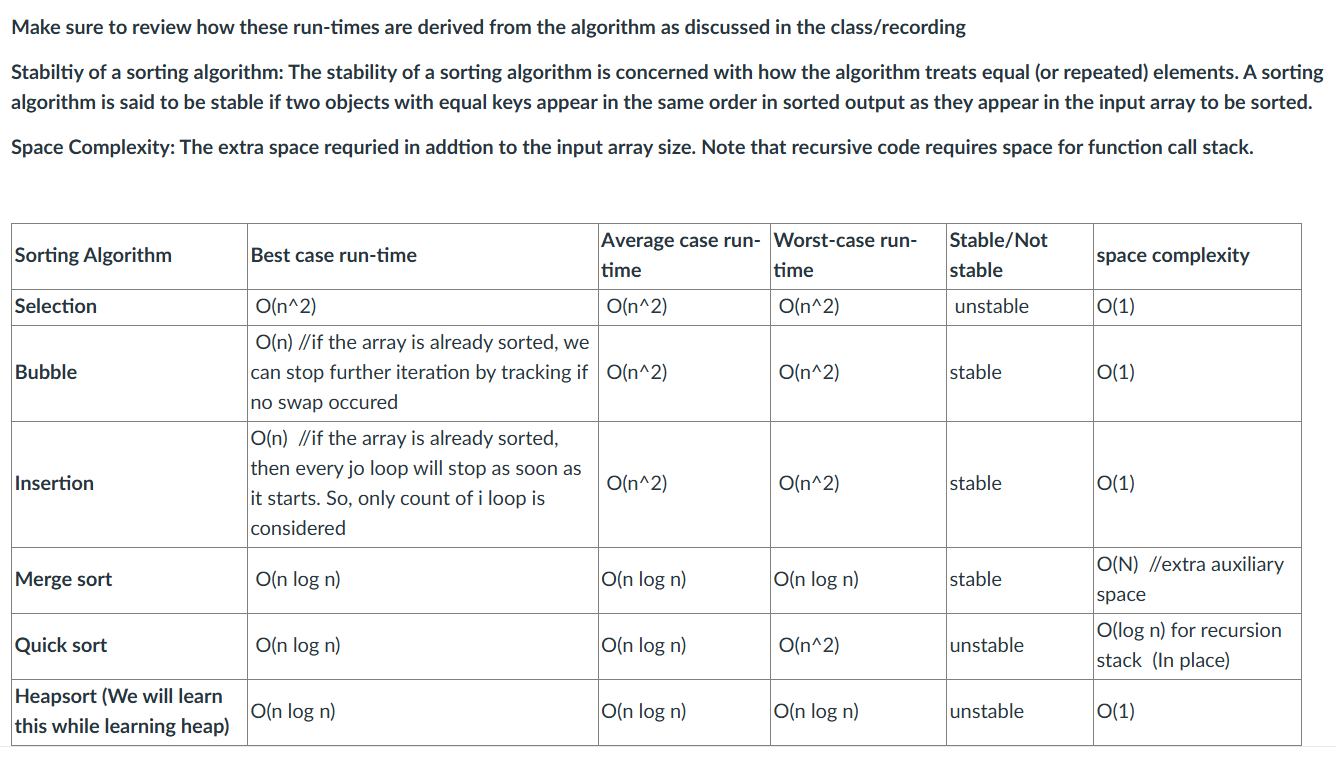 These three below, Bubble, Insertion and Selection sort have a runTime of O(n²). Although these are bad algorithms, it is important to understand how they function.