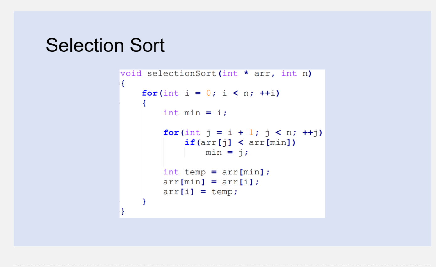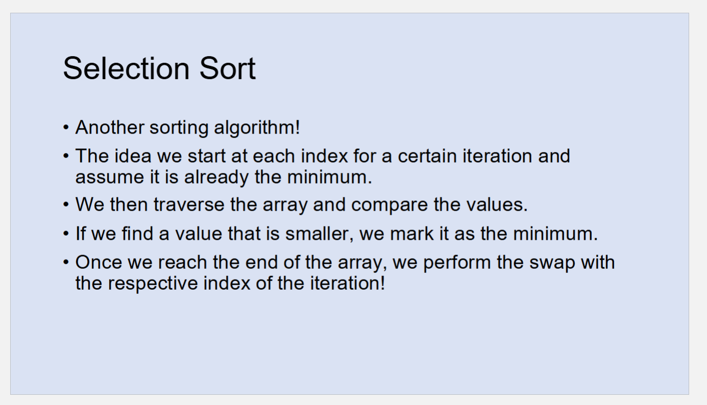 Essentially, it finds the minimum/maximum(doesn’t matter, just with maximum, you would need to reverse it and assign to the last one). After finding the minimum, it would swap it to the respective index, and places it to the first one. it would adjust by one, and constantly finds the minimum, as it starts to the next one.