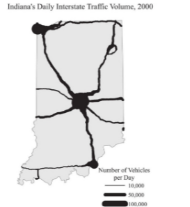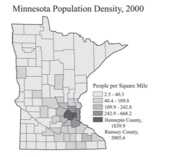 Each unit in a map, such as a county, is shaded according to a variable or attribute, such as population density