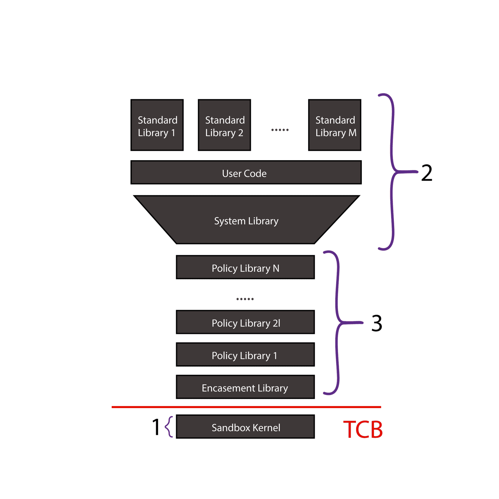 - It starts with a Sandbox Kernel layer, labelled 1 in the diagram * This layer is small and is the only portion of the system that is part of the trusted code base (TCB) * By keeping the TCB so small, we can avoid unnecessary compromises based on code needlessly being in the TCB