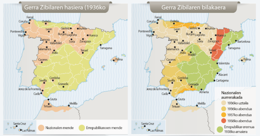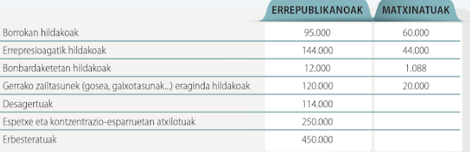 | Gerraren bukaera | 1939an | Bartzelona eta Madrilen, Espaina osoan | Nazionalak irabazi zuten. | Nazionalek irabazterakoan Frankoren diktadura hasten da. |