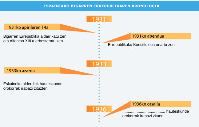| Estatu-kolpe militarra | 1936ko uztailaren 17 eta 18 | 17 an Melillan eta 18an peninstula osoan. | Armadako militar eskuindarrek | Gerra zibil bati hasiera eman zion. Armadak gerra azkar bat izango zela uste zuten,baina erresistentzia jarri zuten ezkerraldetik. |