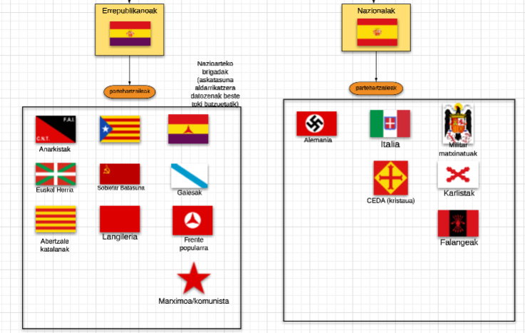 - Nazioarteko brigadak: Gerra garaian askatasuna aldarrikatzera datozenak beste herrialde batzuetatik, hau da ezkerreko ideologia duen taldeari laguntzera joaten direnak.