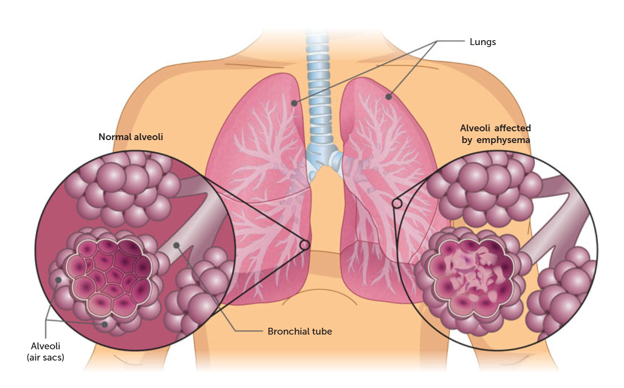 Because of the loss of elasticity in the lungs, they are constantly inflated, meaning breathing in and out no longer happens passively and requires voluntary effort. This causes difficulty in ventilating the lungs for patients.