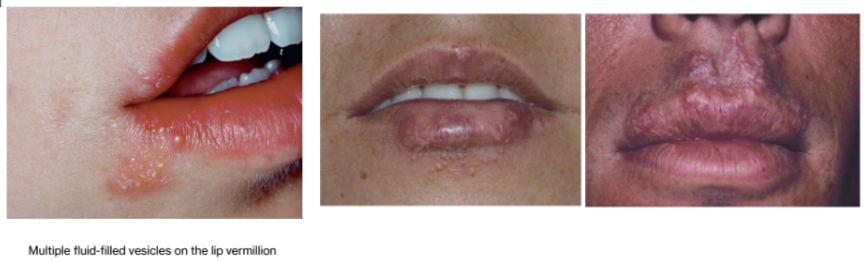 most secondary herpetic lesions occur on the vermilion & perioral skin. These patients have lip discomfort but no systemic signs or symptoms.