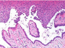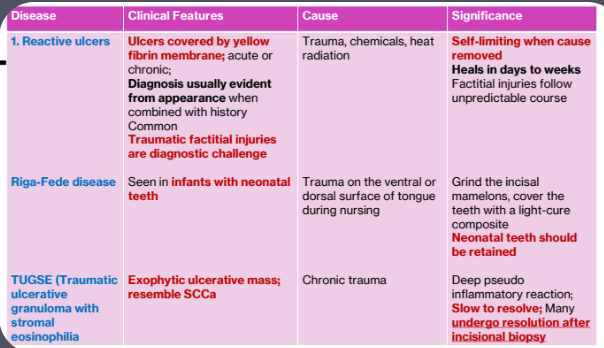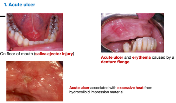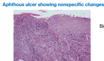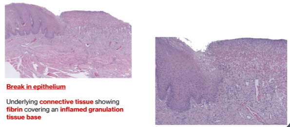 Ulcer: Loss of surface epithelium and exposure of underlying connective tissue.