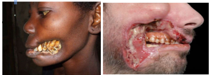 may appear as ulcerated mass in palate or alveolus