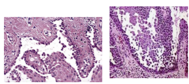 Histopathology: malignant epithelial cells and islands seen in underlying connective tissue