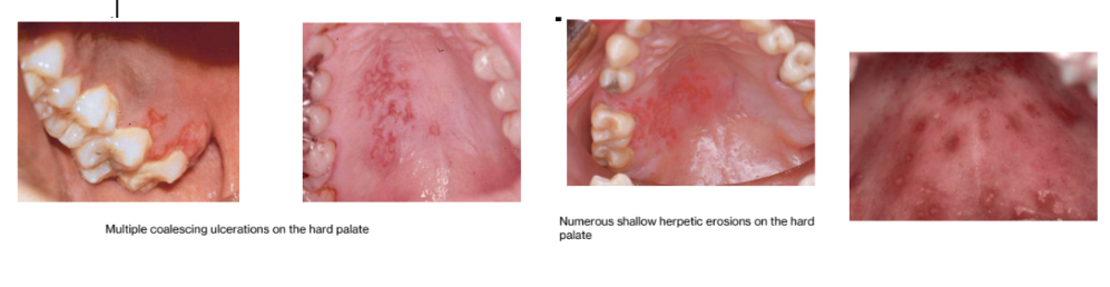 Start as multiple tiny vesicles; rupture to form multiple painful oral ulcers; on any mucosal surface