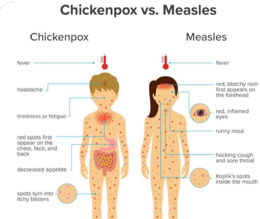 In unvaccinated children starts with malaise, pharyngitis, and rhinitis; followed by an intensely pruritic rash which starts on the skin of trunk and face and spreads to the extremities