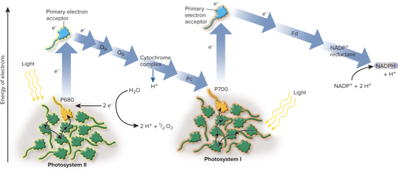 The combined action of PS II and PS I constitutes linear electron flow, which is the primary pathway for light energy conversion and results in the production of \text{O}_2 , \text{ATP} , and \text{NADPH} .