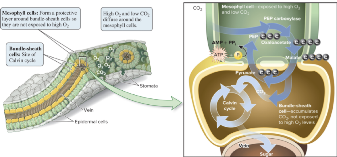 Bundle-sheath cells: These cells surround the vascular bundles. Inside these cells, the 4-carbon compound releases the CO2 creating a high concentration of CO2 that is subsequently used in the Calvin cycle to produce sugars, effectively minimizing photorespiration and maximizing photosynthetic efficiency.