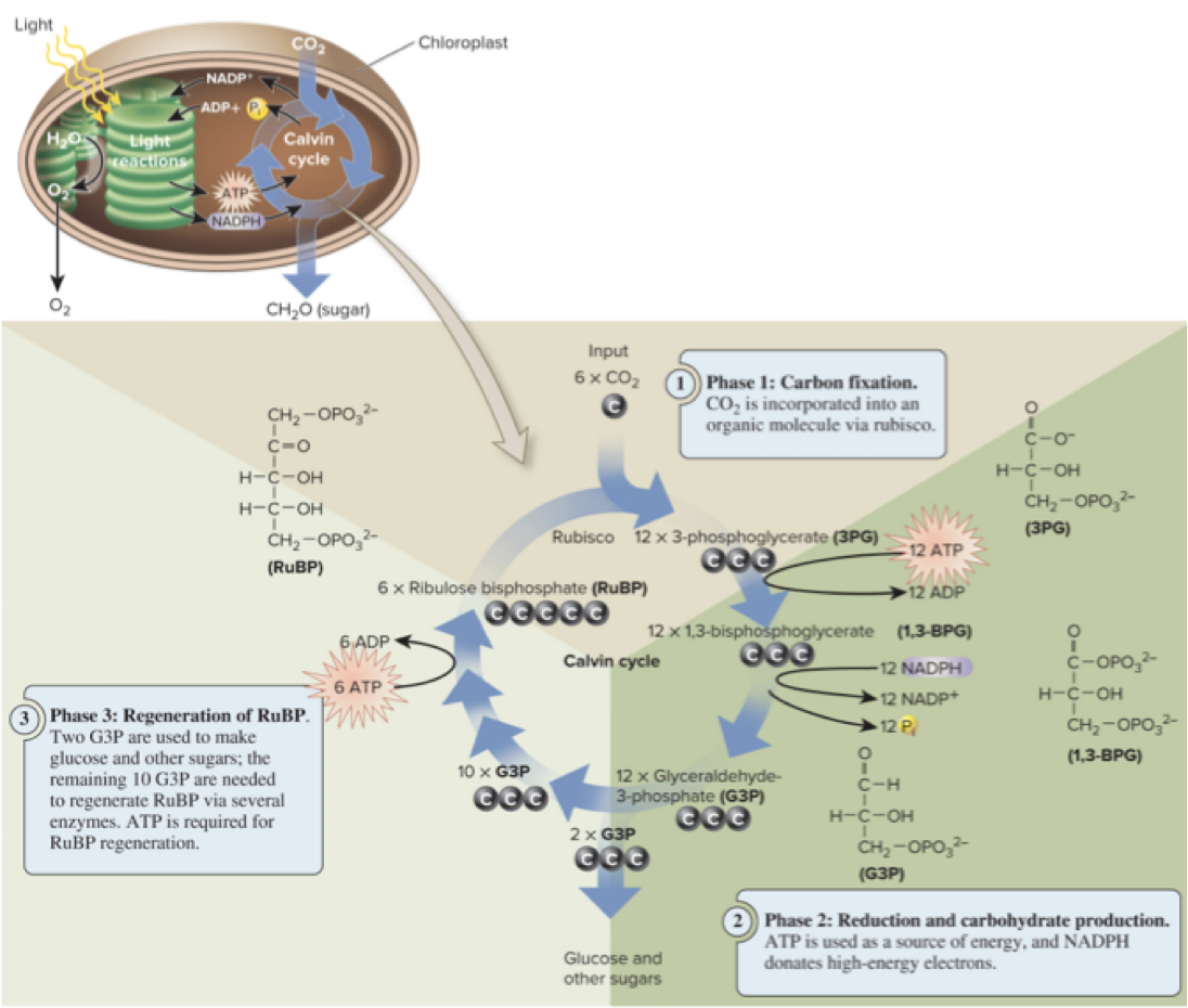 The remaining ten G3P molecules are rearranged and phosphorylated, utilizing ATP (using 6 \text{ ATP} ), to regenerate six molecules of RuBP.