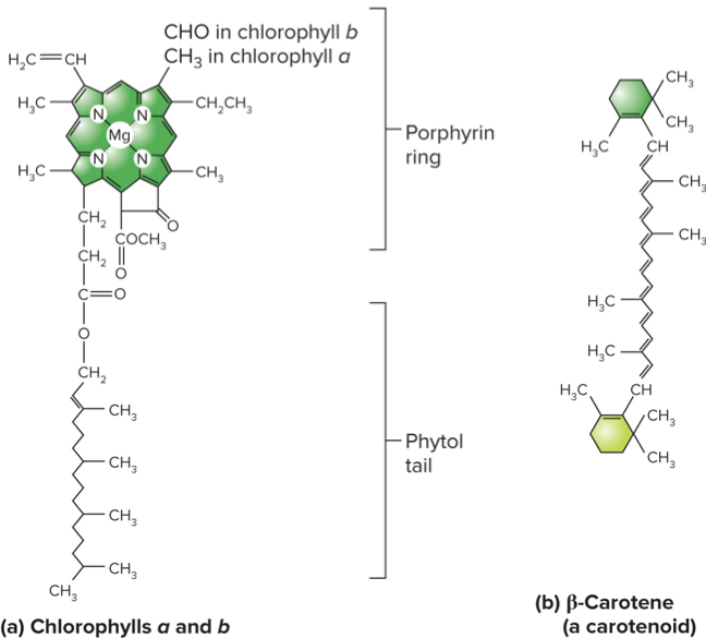 Both contain a porphyrin ring structure with a central magnesium ( \text{Mg}^{2+} ) ion. Within this ring, there is a delocalized electron system that can efficiently absorb light energy.