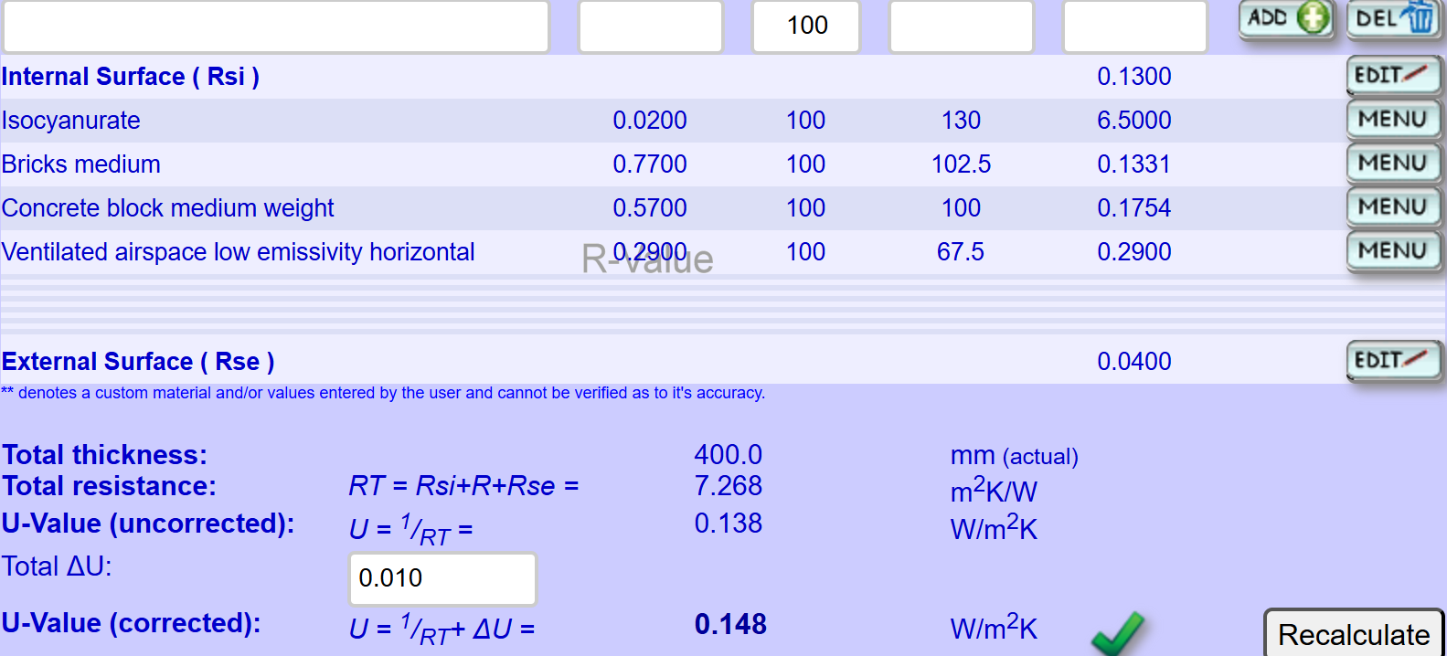 Including internal Rsi = 0.13 and external Rso = 0.04 surface resistances, the approximate value of total thermal resistance is 6.104 m²·K/W. Using the formula 1 / Rtotal, the wall achieves a U-value of 0.164 W/m²K. By slightly increasing insulation thickness to 130mm, the u value is reduced to 0.15, meeting the target.