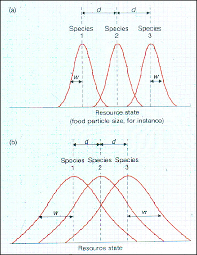Illustrates relationships of species along a resource spectrum, demonstrating niche overlap: