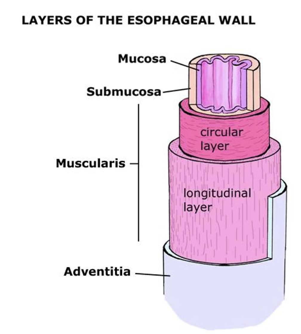 behind the bolus circular muscles contract and longitudinal muscles relax, pinching the esophagus and pushing the bolus down