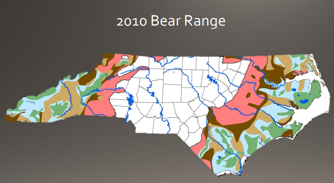 We are currently updating this map, but as you can see, as of 2010, bears occupied ~60% of the state. Again, this is based on evidence of breeding females. We have documented bears in all 100 counties of NC, but what is meaningful is when we document bears becoming established in an area Occupied Bear range into certain areas is partially due to the travel corridors created by the major and minor river systems in North Carolina. Here we see how range has followed along the Catawba river, Yadkin River, Roanoke, the Cape Fear River, the Neuse River, and the Tar-Pamlico River.