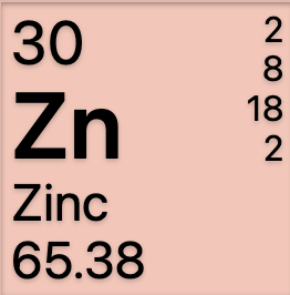 Zinc (Zn, Atomic Number: 30, Atomic Weight: 65.38, Group 12, Period 4, d-block)