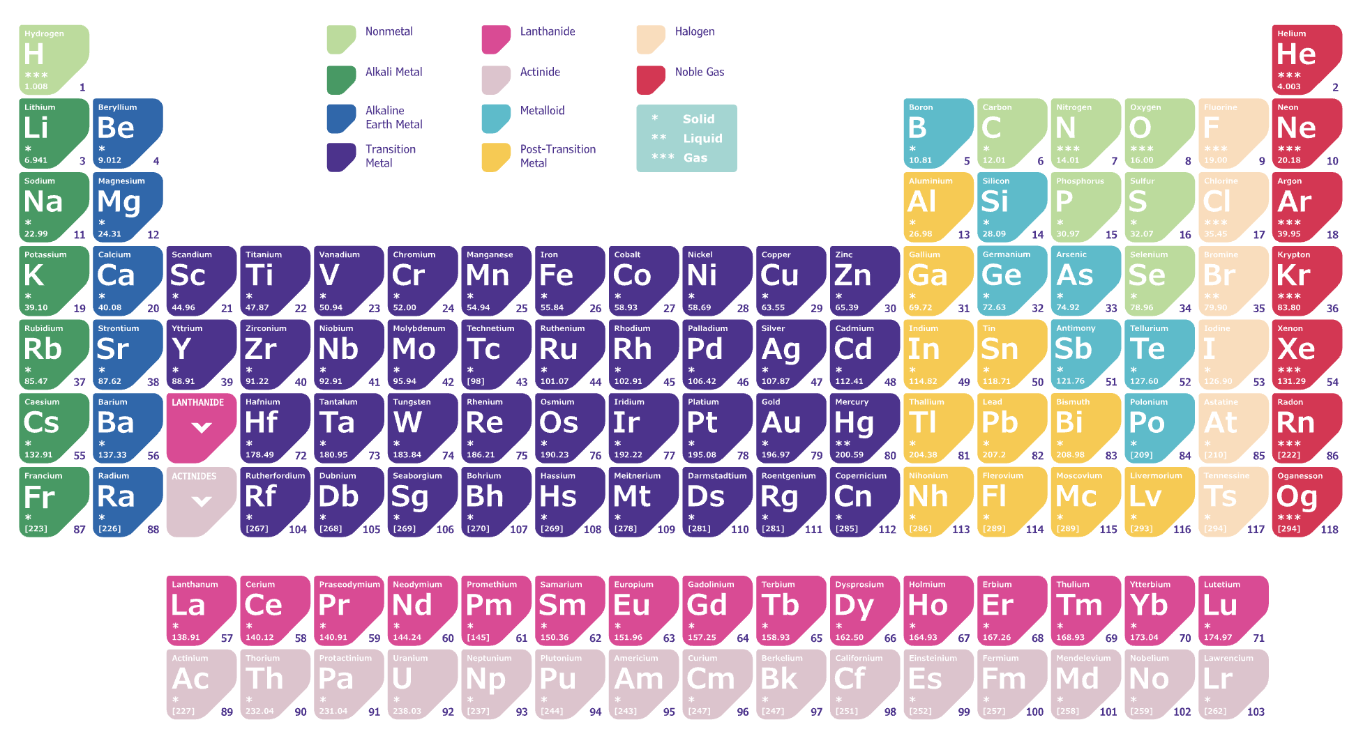Contains all known elements, organised by chemical properties (families) and increasing atomic number/size.