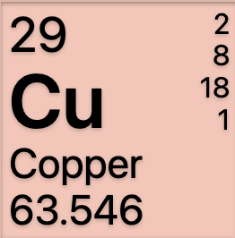 Copper (Cu, Atomic Number: 29, Atomic Weight: 63.546, Group 11, Period 4, d-block)
