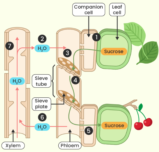 sucrose diffuses from the source cells into the sieve tubes by diffusion through the cytoplasm and plasmodesmata