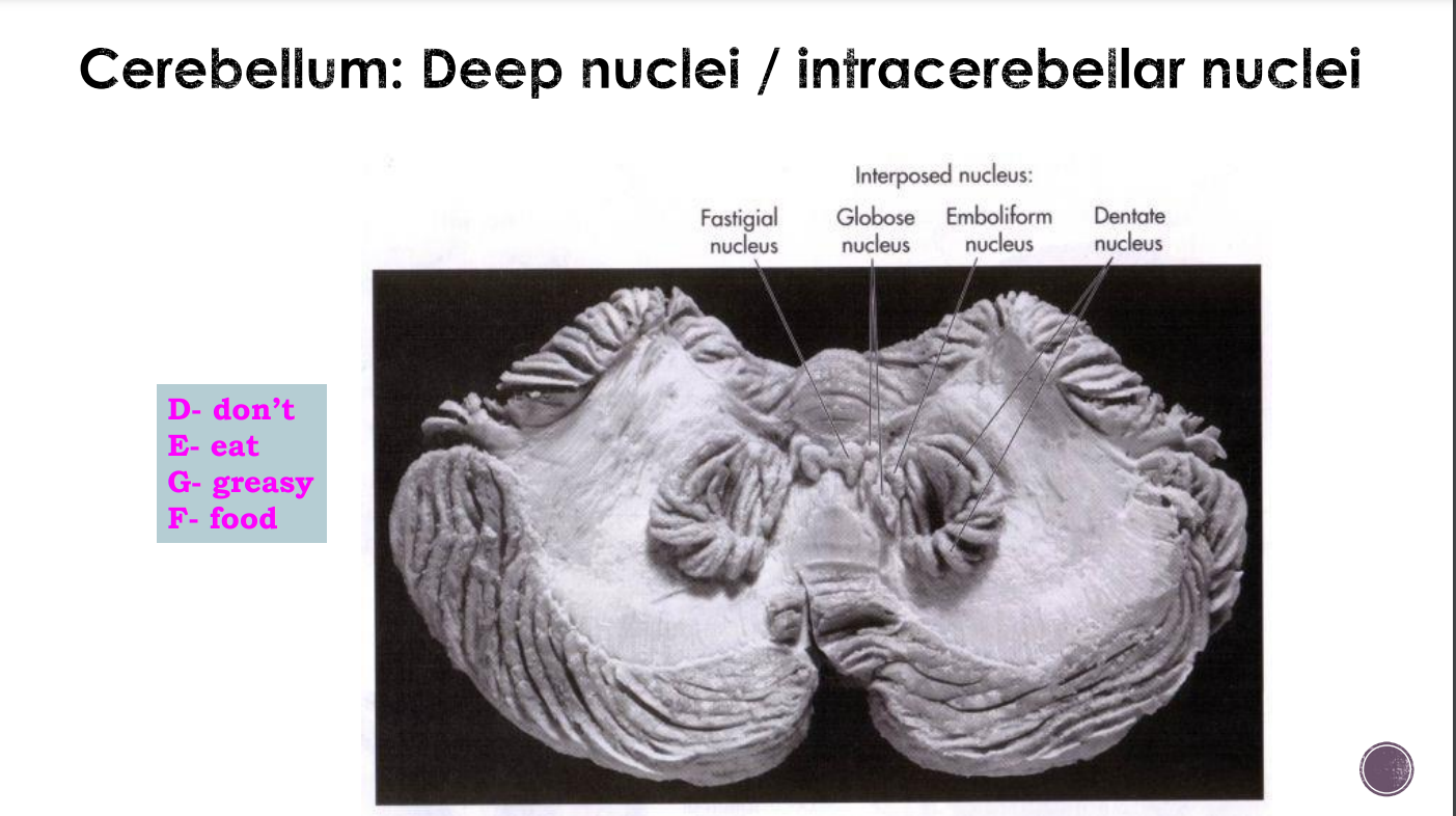 Dentate nucleus – receives input from the lateral hemisphere of cerebellum