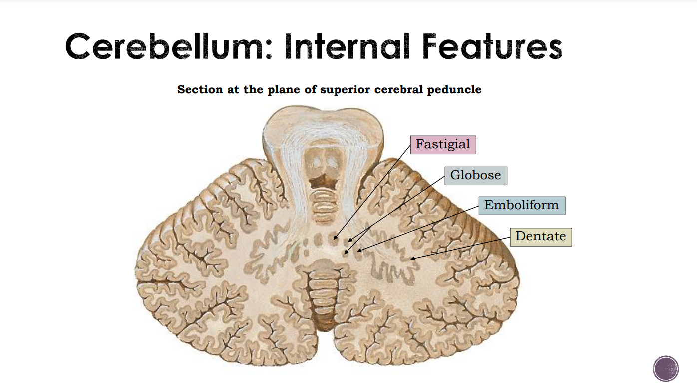 Fastigial nucleus – receives input from the cortex of flocculonodular lobe and vermis