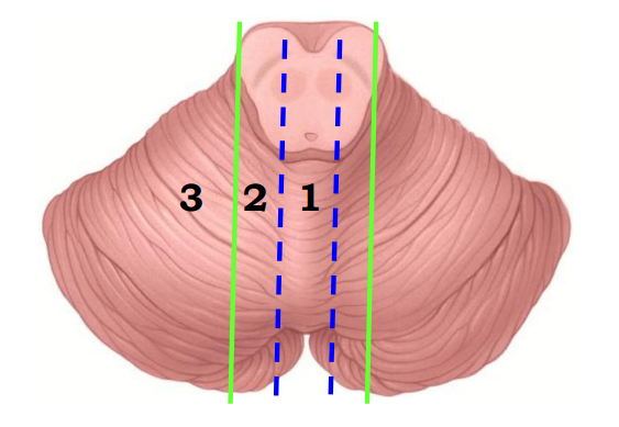 Cerebellum can be divided into 3 longitudinal zones (based on functional & connections)