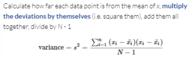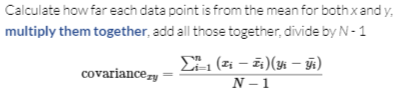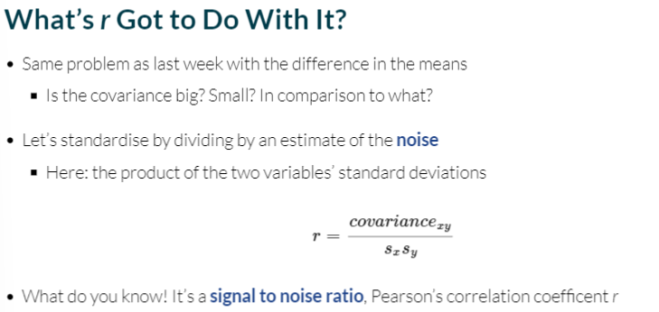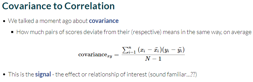 - covariance - how much pairs of scores deviate from their (respective) means in the same way, on average