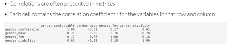 - correlation - the (standardised) degree to which two variables covary * calculated as covariance divided by the product of the standard deviations * quantifies both the strength (absolute value) and direction (sign) of the relationship between -1 and 1 * correlation is a technical term - do not say two things are correlated unless you report r as evidence