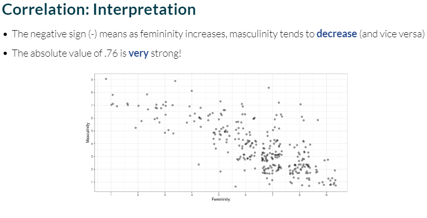 - always has a value between -1 and 1 * strength - absolute value of r between 0 (no relationship at all) and 1 (perfect relationship) * direction - the sign of r (positive or negative) * positive - as one variable increases, the other tends to increase * negative - as one variable increases, the other tends to decrease