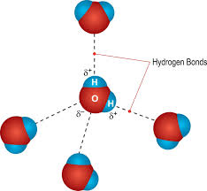 Illustration of water molecule bonds and capability to form four hydrogen bonds with neighboring water molecules.