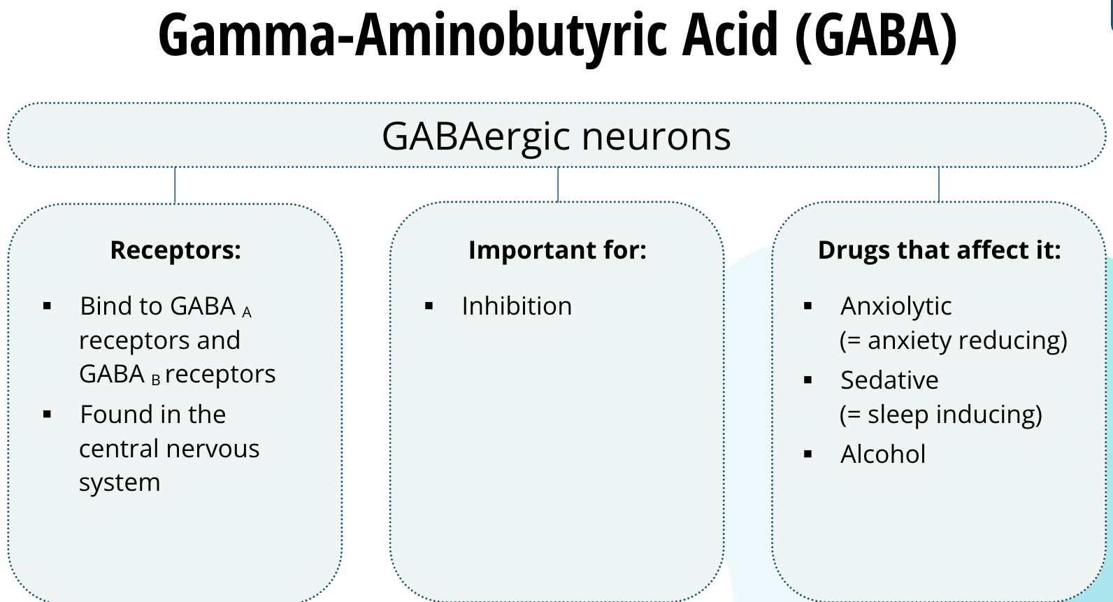 Neurons that release GABA are called GABAergic neurons. GABA binds to two main types of receptors called GABAA receptors and GABAB receptors. They are found abundantly in the central nervous system. GABA is the predominant inhibitory neurotransmitter in the brain and spinal cord. Anxiolytic (meaning anxiety reducing) and sedative (meaning sleep inducing) drugs bind to GABA receptors. Alcohol is also thought to affect the GABA receptors.
