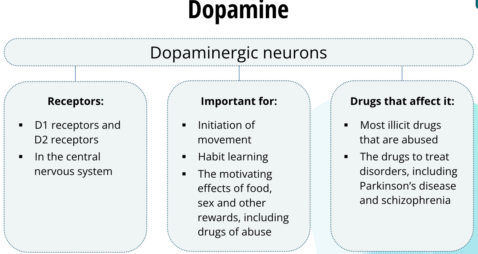 Neurons that release dopamine are called dopaminergic neurons. Dopamine binds to two families of receptors called the D1 receptors and D2 receptors. These receptors are found largely in the central nervous system. Dopaminergic neurons are thought to be important for the initiation of movement, habit learning, and the motivating effects of food, sex, and other rewards, including drugs of abuse. Most illicit drugs that are abused all have in common that they increase dopamine neurotransmission in the brain. Dysregulation of dopamine is thought to underlie several disorders including Parkinson’s disease and schizophrenia. Drugs used to treat these disorders affect dopamine neurotransmission.