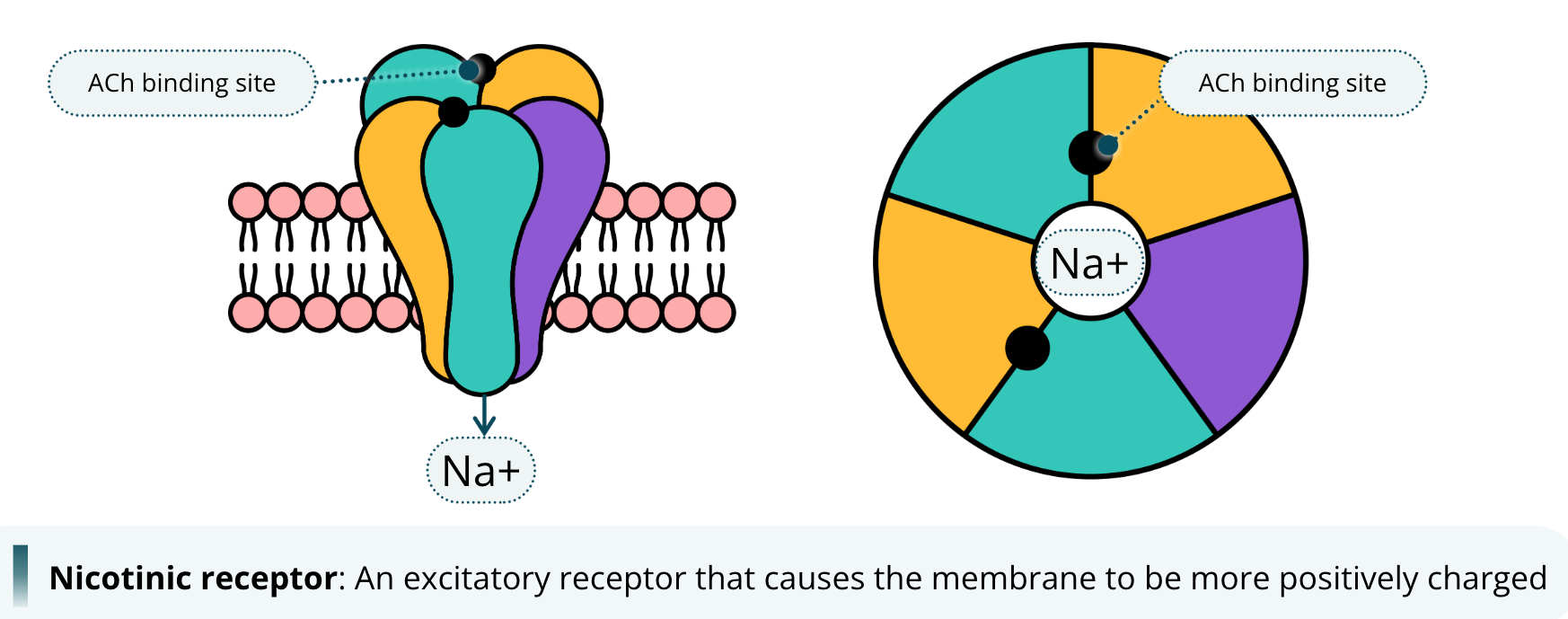 An example of a receptor that causes the membrane to be more positively charged when it is open is the nicotinic receptor. This receptor is bound by the neurotransmitter acetylcholine, abbreviated as ACh. We call it the nicotinic receptor because it is the acetylcholine receptor that also potentially binds to the drug nicotine. Yes, the same nicotine found in tobacco products. When acetylcholine binds to the nicotinic receptor, the channel opens and allows sodium ions to cross the membrane. The influx of sodium ions into the neuron causes the membrane to become more positively charged, and has the potential to depolarize the neuron, causing it to fire. For this reason, we say that nicotinic receptors are excitatory.